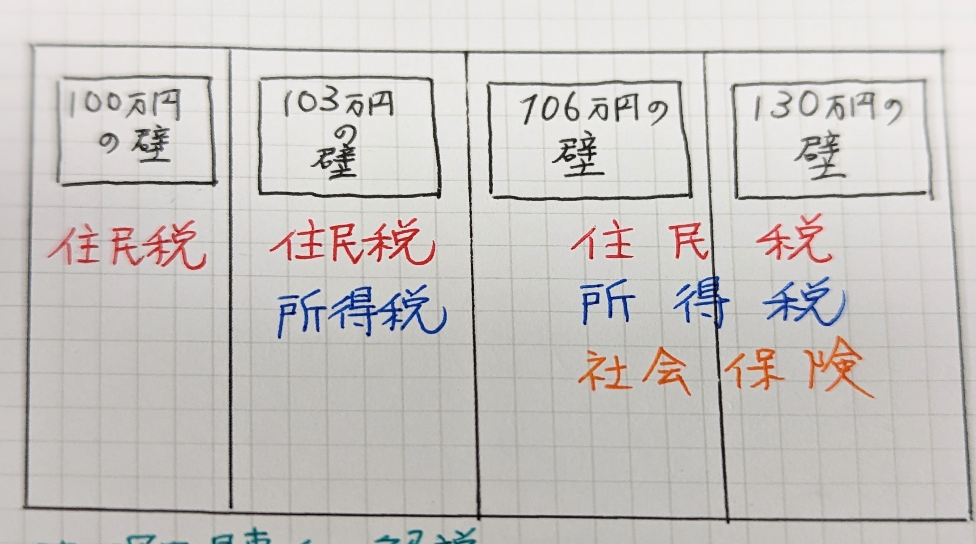 年収の壁とは、収入が一定額を超えると、住民税や所得税、社会保険料を負担しなければならない金額を指しています。